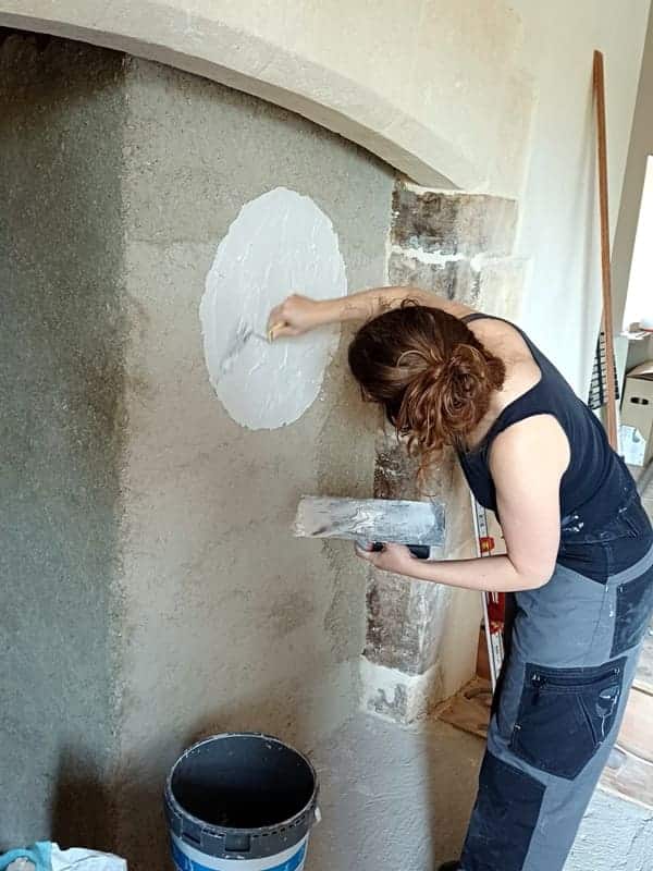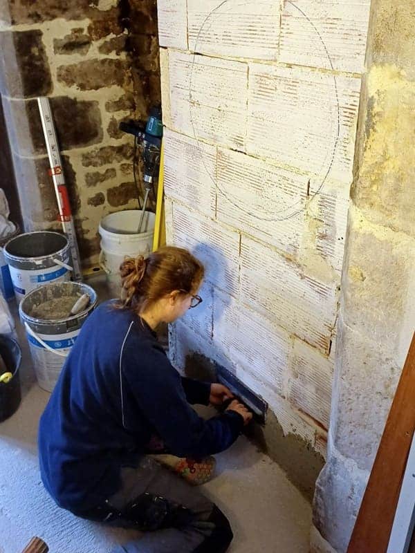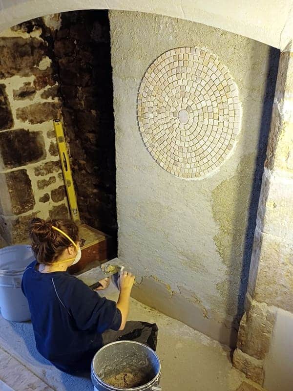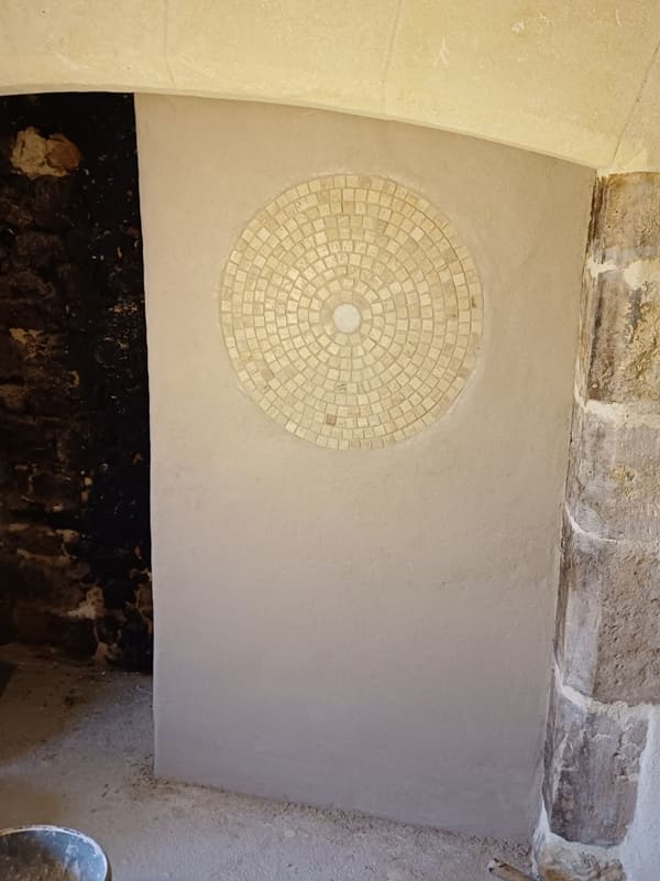 Mais qu’à cela ne tienne, on n’est pas du genre à se laisser abattre ! Après réflexion, on décide d’isoler ce nouveau conduit avec une couche de chanvre-chaux, puis de le finir avec une couche de sable chaux. Mais comme on aime bien les petites touches originales, on y fait une mosaïque de décoration, fabriquée maison.